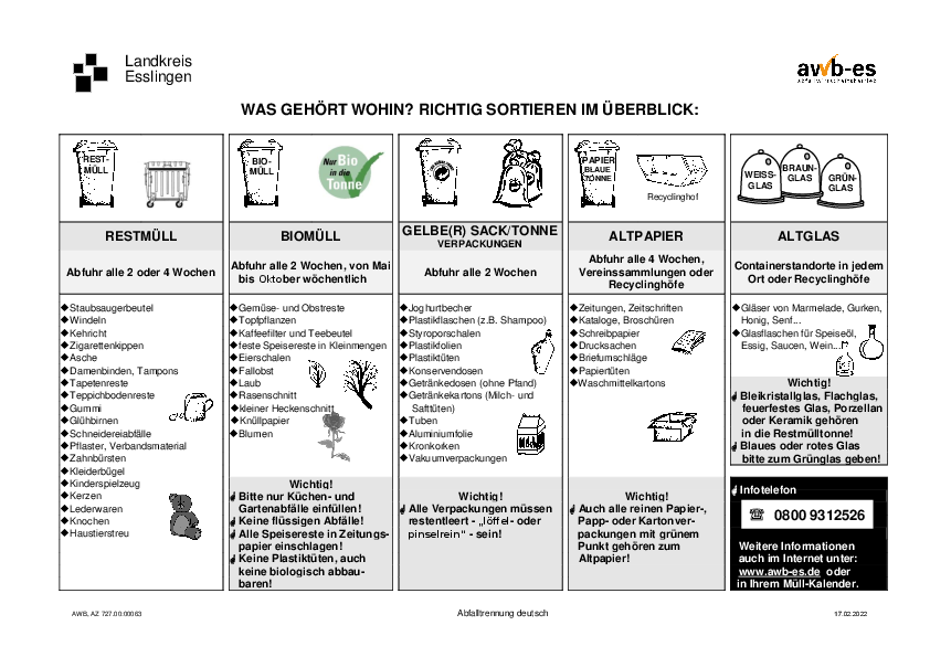 Damit Abfälle umweltgerecht entsorgt und wertvolle Rohstoffe recycelt werden können, ist die richtige Mülltrennung besonders wichtig. Der Abfallwirtschaftsbetrieb Esslingen (awb-es) stellt eine übersichtliche Infografik bereit, die genau zeigt, was in welche Tonne gehört – von Restmüll über Biomüll bis hin zu Papier, Verpackungen und Altglas.